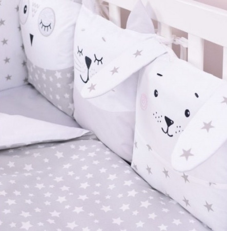 Постельный комплект Smiling animals изготовлен из натурального хлопка, обладающего хорошей воздухопроницаемостью, безопасен для детской чувствительной кожи, поскольку не вызывает аллергических реакций при использовании, имеет высокую износостойкость и долговечность, при частой стирке сохраняет свой внешний вид и прочность швов. Пододеяльник на молнии – удобный и практичный в использовании. Наполнитель бампера – холлофайбер – гипоаллергенный, хорошо держит форму, а подушки и одеяла - soft fiber - мягкий и приятный на ощупь, обеспечивает «дышащие свойства», терморегуляцию. Одеяло простёгано, что обеспечивает сохранность формы изделия после стирки. Все материалы постельного комплекта сертифицированы и отвечают высоким требованиям экологических стандартов.