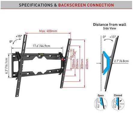 Стандарт VESA75x75, 100x100, 100x200, 200x100, 200x200, 300x300, 300x400, 400x300, 400x400 мм