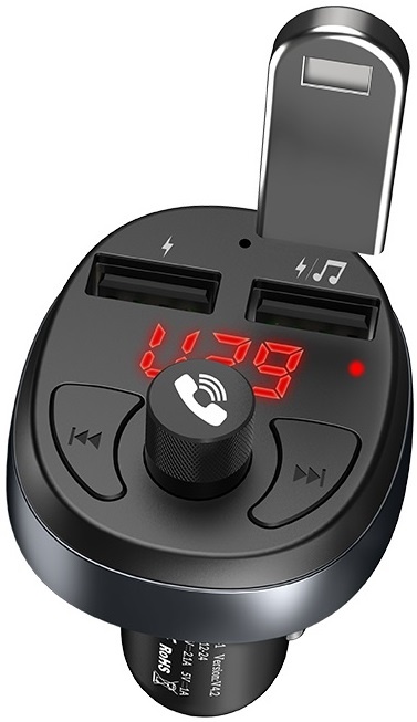 Особенности: поддержка Bluetooth V 4.2, позволяет быстро зарядить устройство и воспроизводить музыку с телефона, планшета или USB накопителя; FM трансмиттер (диапазон 87,5-108 МГц); 2 USB выхода с цифровым дисплеем на котором отображается FM частота.