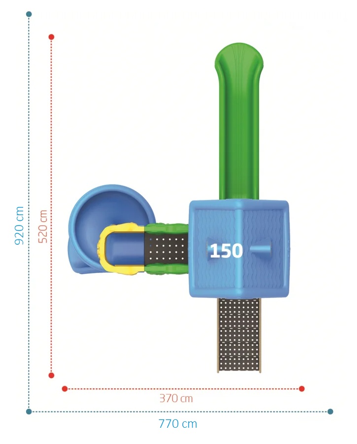 Материал: изготовлен из металлических труб диаметром 114 мм и толщиной стенки 3 мм. Порошковая окраска. Пол домика и лестница изготовлены из металла толщиной 3 мм и покрыты слоем ударогасящей резины. Остальные элементы изготовлены из толстостенного двухслойного армированного пластика LLDPE. Пластиковые детали изготовлены из антистатического материала, безвредного для здоровья, устойчивого к УФ-излучению. При установке изделие бетонируется. Базовая комплектация: лестница с поручнями, Башня - PALACE (высота от земли 1500 мм), прямая горка, винтовая горка, мост.