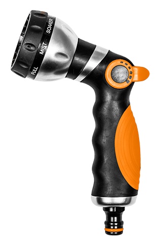 Пистолет BRADAS ECO-2038 эргонометричный металлический пистолет для полива с плавной регулировкой напора воды. 8 функций выбора типа струи. Имеет быстросъемный коннектор.