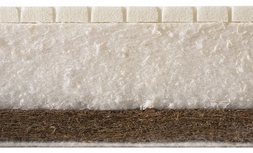 В качестве настилочного материала более жесткой стороны использована латексированная кокосовая койра. Она обеспечит правильное формирование и развитие здорового позвоночника малыша. Спать на ней рекомендуется новорожденным.