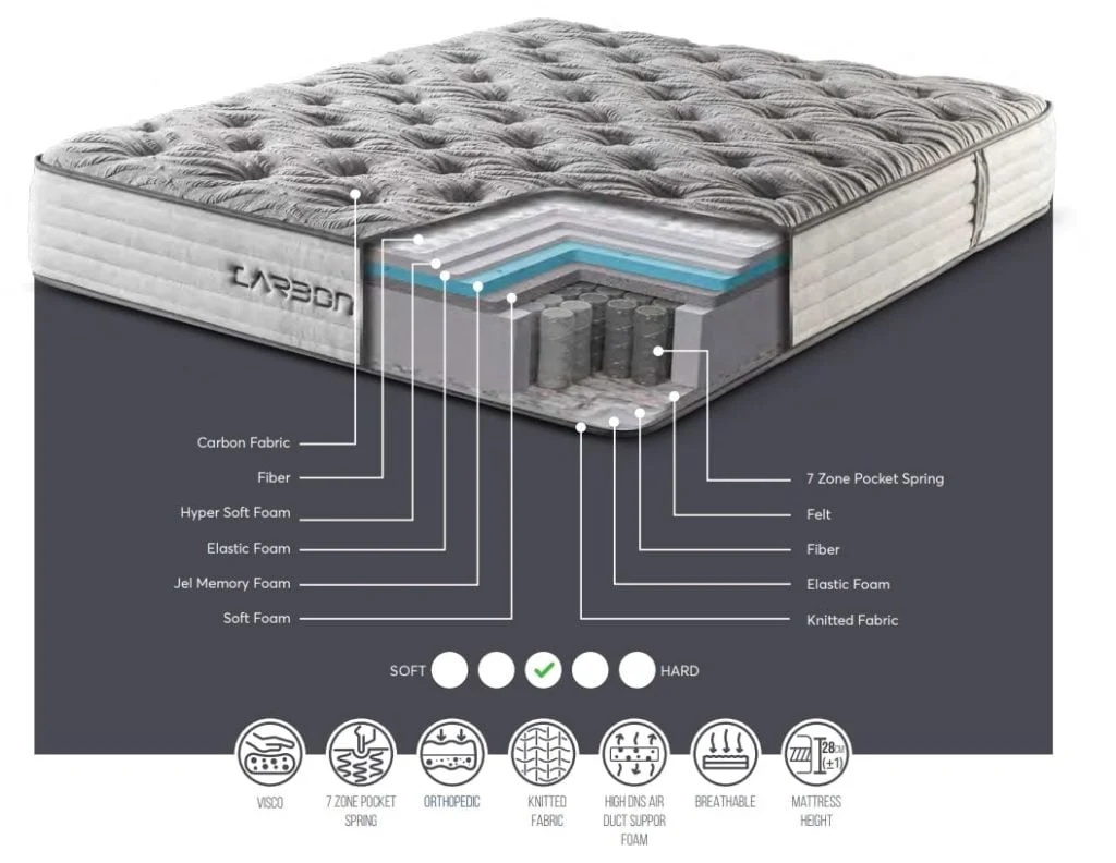 Турецкий матрас, с 7-ми зонами жесткости для наилучшей поддержки тела. В основе матраса лежит блок независимых пружин Pocket Spring — 1280 шт. Также в состав входят оригинальные наполнители самого высокого качества такие как Латекс, Войлок, эластичная пенна HyperSoft. Матрас ортопедический, принимает форму тела. За счет большого количества пружин снижается нагрузка на тело и позвоночник. Такой матрас обеспечит максимально хорошую поддержку позвоночника. Глубокая стежка чехла придает матрасу богатый вид. Чехол матраса изготовлен из турецкой трикотажной плетенной ткани.с волокнами карбона.
