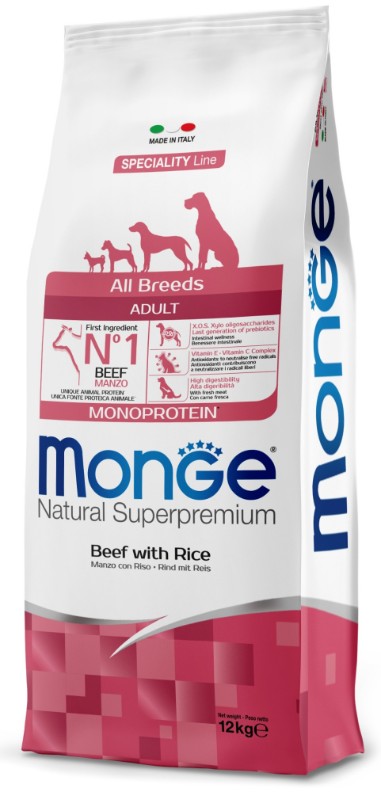 Monge (Монж/Монже) Dog All Breeds Beef and Rice корм для собак всех пород говядина с рисом 12 кг. Полноценный сбалансированный рацион для взрослых собак всех пород с особыми потребностями. В состав входят отборные гипоаллергенные источники белка животного происхождения, что позволяет легко исключить из рациона ингредиенты, вызывающие аллергию. Говядина и рис являются источниками легкоусваиваемых белков и углеводов, поэтому данный рацион прекрасно подходит собакам с проблемами пищеварения и кожными заболеваниями.