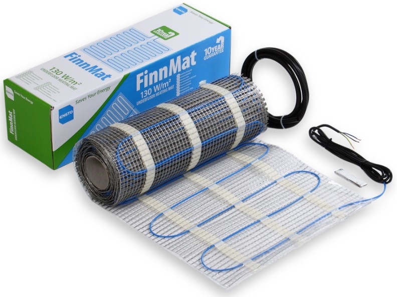 Нагревательный мат FinnMat EFHFM130.10 Ensto имеет толщины кабеля всего 4 мм. Это позволяет укладывать его в слой плиточного клея. Удельная мощность составляет 130 Вт/м кв., что предполагает использование мата в качестве источника дополнительного обогрева (так называемый комфортный обогрев) во влажных и сухих помещениях с хорошей теплоизоляцией. Кроме кафельной плитки, в качестве напольного покрытия может быть использован специальный ламинат, кварц-виниловая плитка, паркет и др. В этом случае, нагревательный мат укладывается в выравнивающую стяжку.
