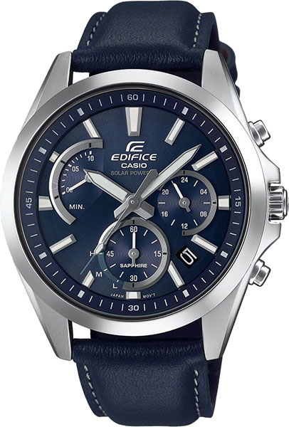Chronograph. Питание от солнечной энергии, индикатор уровня зарядки батареи. Как и все часы из коллекции Edifice эта модель водонепроницаема, а циферблат защищен высокопрочным сапфировым стеклом. Светонакопительное покрытие необрит продолжает светиться в темноте даже после непродолжительного пребывания на свету. Часы-хронограф с секундомером с точностью показаний 1с и временем измерения 10мин. Ретроградный указатель минутной стрелки хронографа. 12-ти и 24-х часовой формат времени. Заводная головка с защитой. Задняя крышка с винтовым фиксатором.