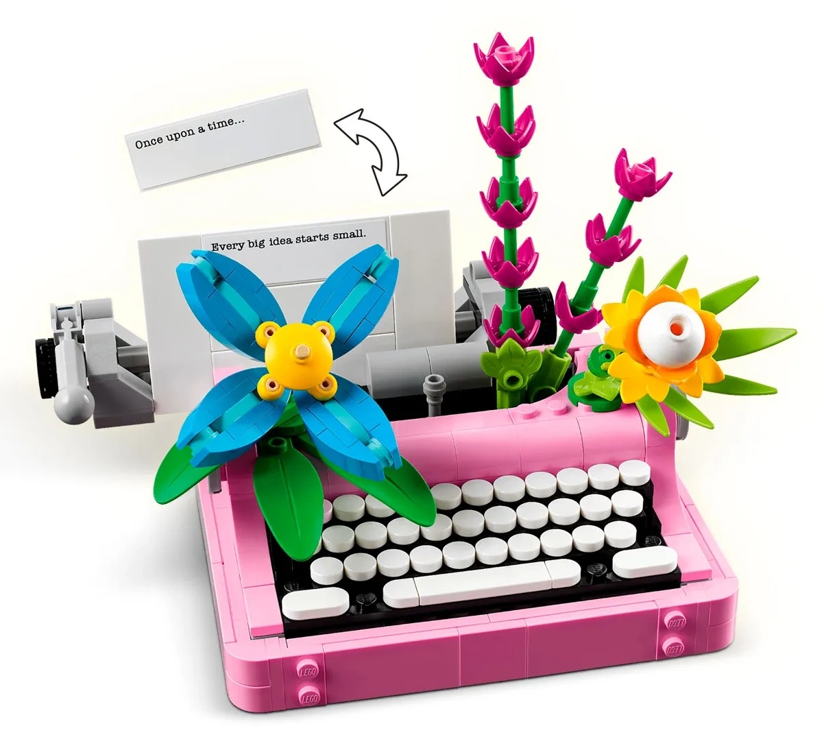 У поклонников LEGO есть выбор из 3 различных наборов для изготовления цветов: пишущая машинка с Игрушка с цветами; игрушечный музыкальный инструмент keytar на подставке с цветами; или цветочный горшок с ручкой и блокнотом. К набору для сборки игрушек также прилагаются 3 наклейки с продуманными фразами, которые дети могут использовать для украшения собранных из кирпичиков моделей.