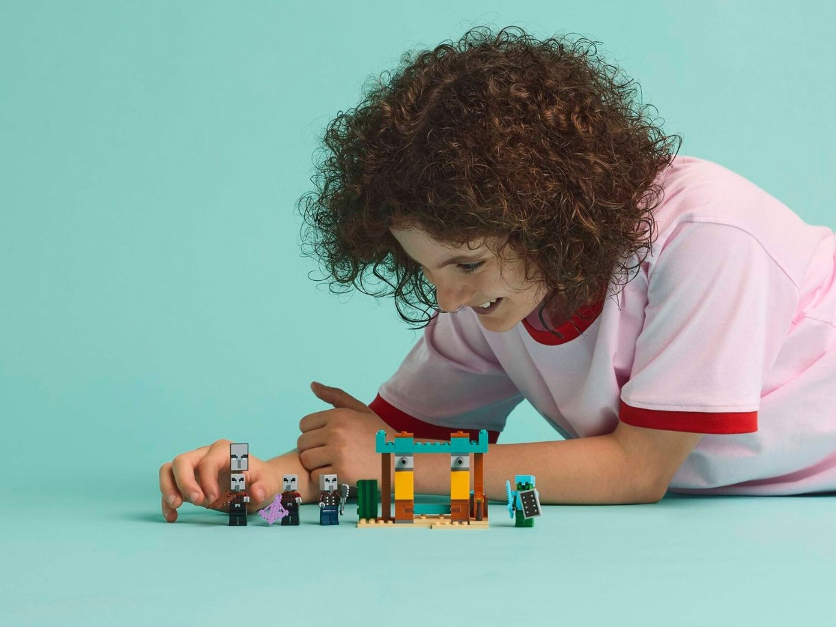 Действие разворачивается на аванпосте в пустыне Майнкрафт, где дети играют в роли рыцаря-кактуса в алмазных доспехах, щите и мече. Когда 3 фигурки из мультфильма приходят, чтобы украсть сокровища, дети должны защитить аванпост. В набор входят ракеты, которые дети могут запускать одним движением пальца, разнообразное оружие и бочка с сокровищами. Для дополнительного развлечения в цифровом формате приложение LEGO Builder позволяет детям увеличивать и поворачивать модели в 3D с помощью своего устройства.