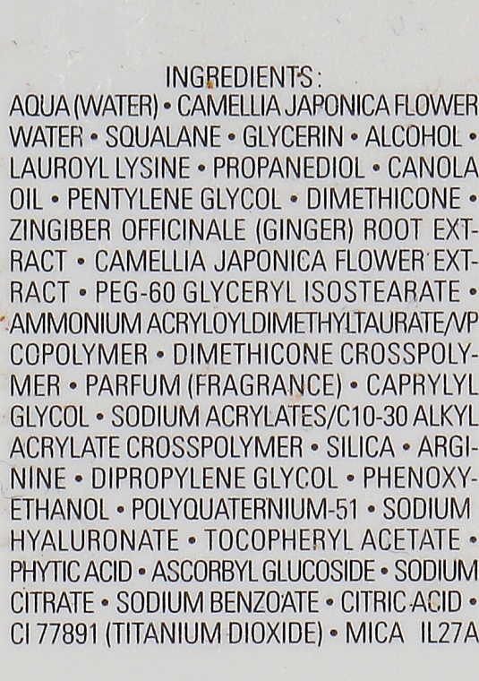 Увлажняющее действие белой камелии усиливает гиалуроновая кислота, которая разглаживает и повышает упругость кожи.