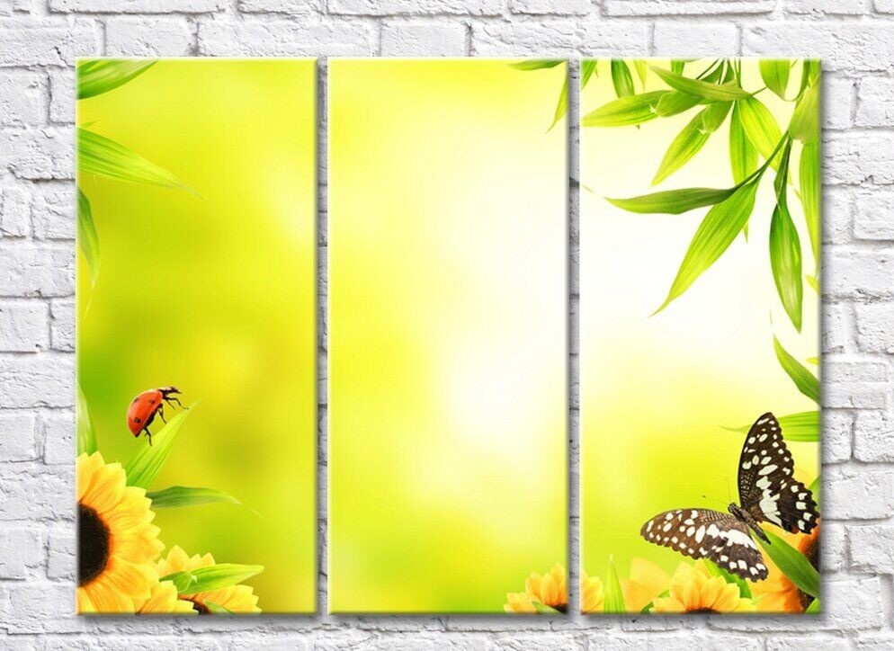 Картина Rainbow Variegated butterfly and ladybug on a yellow green background with plants (500509)