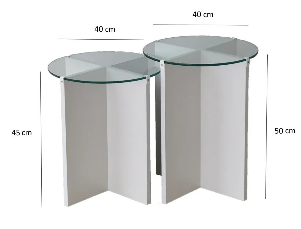 Набор включает два столика, каждый диаметром 40 см. Первый столик имеет высоту 50 см, второй немного выше — 60 см. Это позволяет использовать их отдельно или складывать друг в друга для экономии пространства.