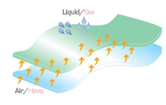 Верхняя сторона выполнена из хлопчатобумажного полотенца, а нижняя – из ткани с полиуретановой мембраной.