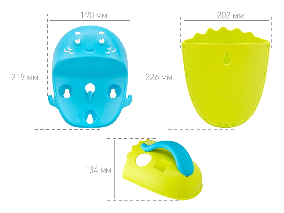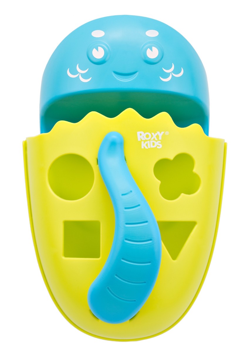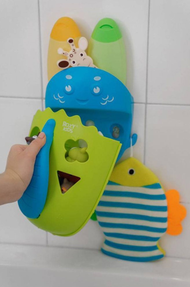 Органайзер с полкой для хранения игрушек и банных принадлежностей от ROXY-KIDS – это улучшенная версия органайзера-сортера DINO. Одно дополнение в виде базы в разы увеличило потенциал этого аксессуара для ванной. Теперь точно не придется искать мыльные принадлежности малыша: на полку можно поставить шампунь и гель, на крючки по бокам повесить мочалки, а при помощи органайзера быстро собрать все игрушки.
