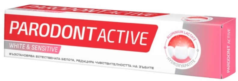 Зубная паста Parodont Active WHITE & SENSITIVE: - останавливает кровотечение, стягивает и успокаивает десны.