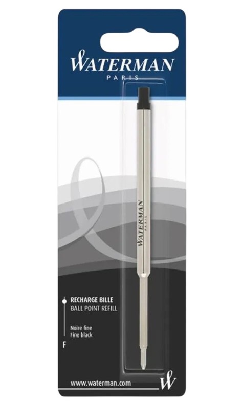 Сменный шариковый стержень для ручек Waterman с чёрными чернилами и тонкой толщиной письма.