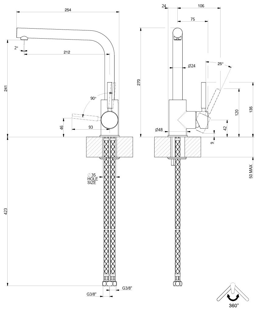 Угол поворота излива360 °