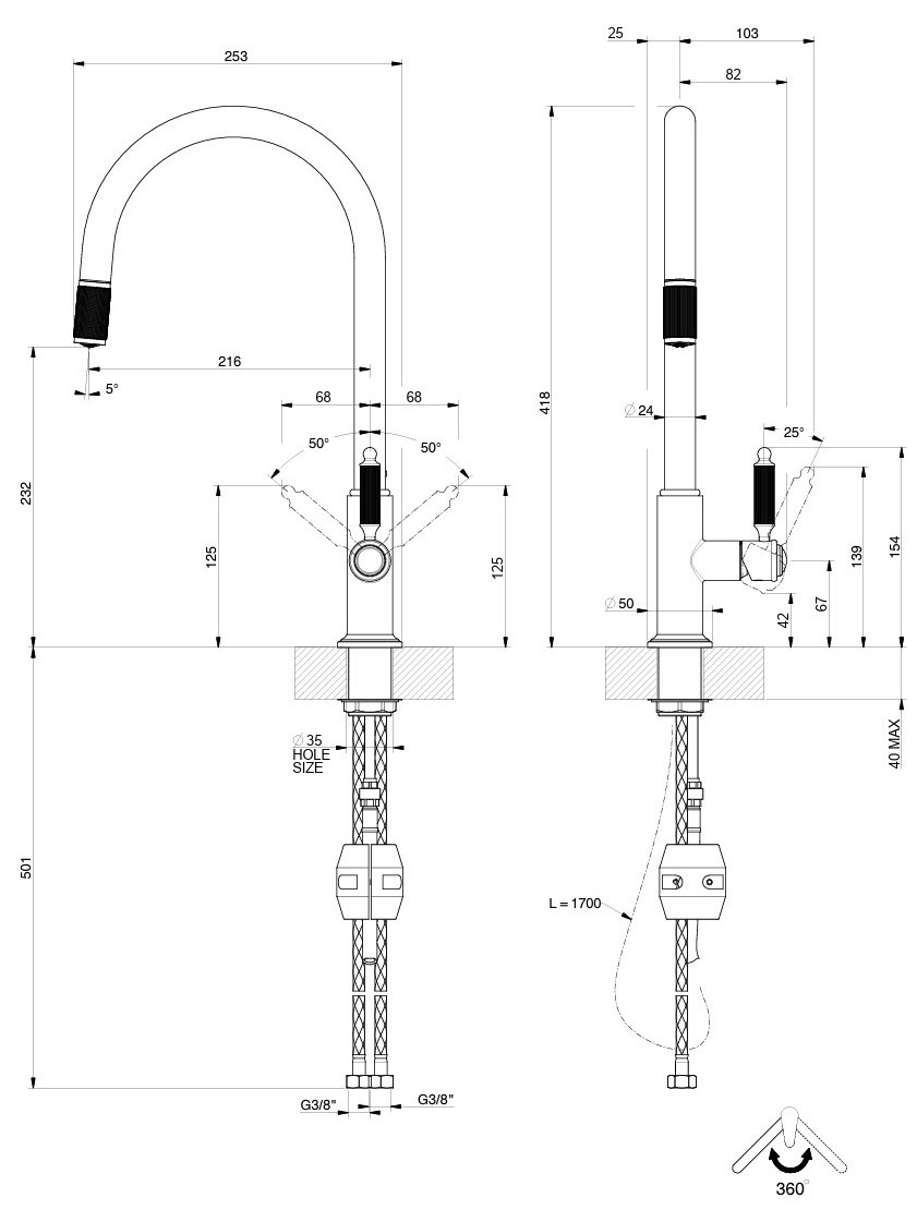 Угол поворота излива360 °