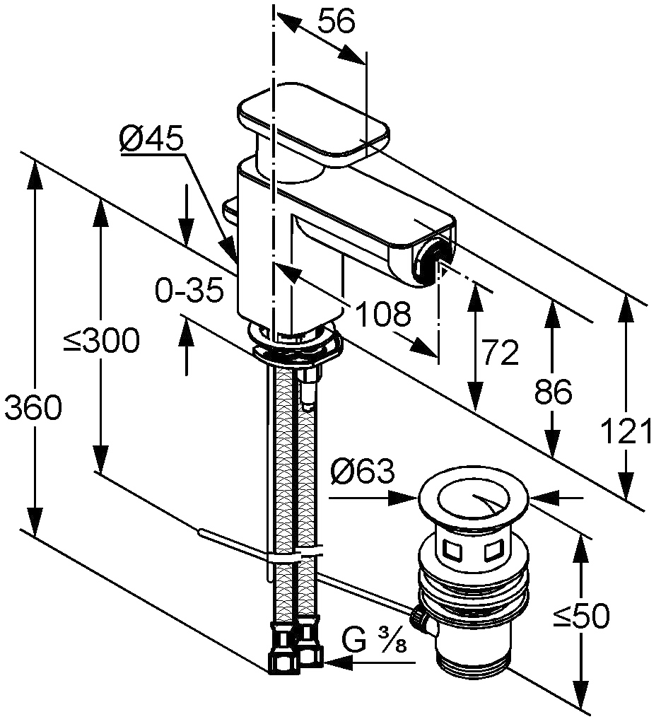 — гибкий подвод воды G 3/8;