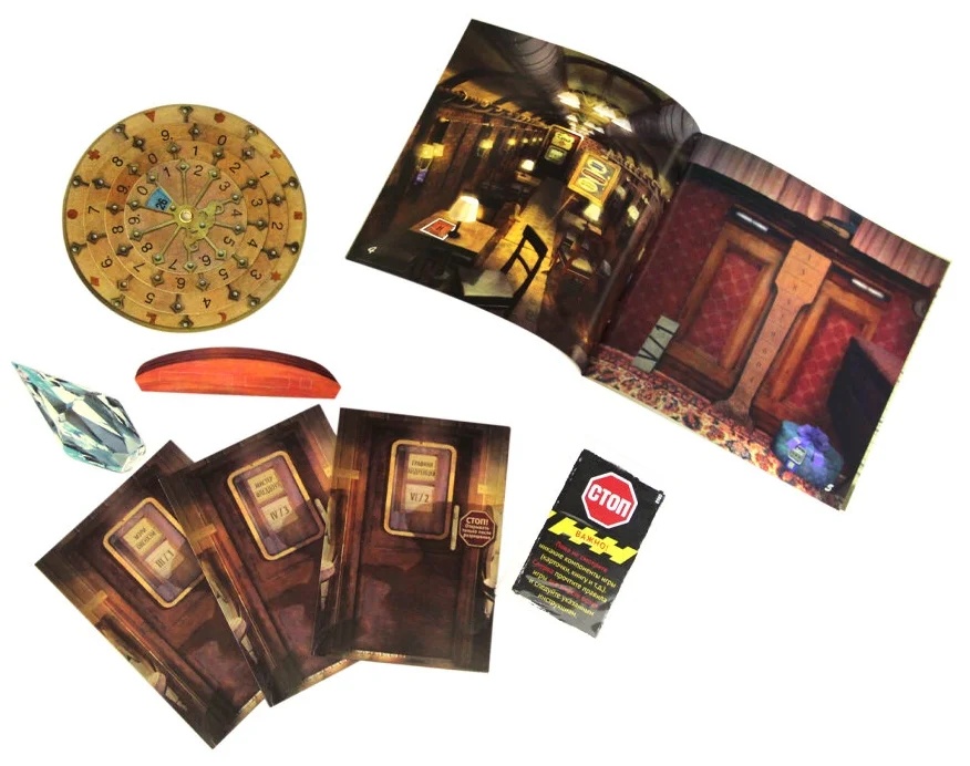 Комплектация1 диск декодер, 86 игровых карточек, 2 странных предмета, 1 книжка, 1 правила игры, 3 закрытых листа купе