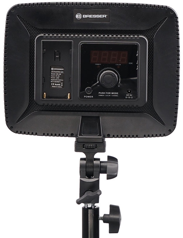 Встроенный рассеиватель обеспечивает мягкое освещение. BR-24B может питаться от батареи NP-F (не входит в комплект). Это означает, что лампу можно использовать где угодно. Эта светодиодная лампа имеет соединение 2,4 ГГц, поэтому ее можно комбинировать с несколькими светодиодными лампами Bresser, которые также имеют это соединение. Поэтому также возможно использовать лампу с дистанционным управлением.