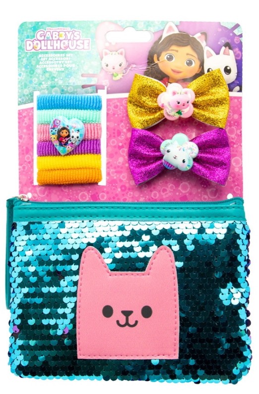 Красивый набор для волос с различными аксессуарами для волос очарует вашу юную принцессу. В набор входят 6 резинок для волос, 2 заколки с блестками в виде персонажей кукольного домика Габби и красивая косметичка.