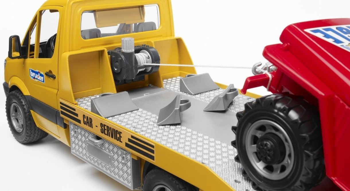 Эта игрушечная модель эвакуатора Mercedes Sprinter от немецкого производителя очень качественных детских игрушек BRUDER - отличная игровая копия машины для эвакуации автомобилей. Также в комплекте идет игрушечный джип.