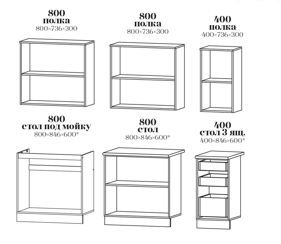 — Размеры нижних модулей: высота 846; глубина 600 мм (с учетом столешницы 28 мм)