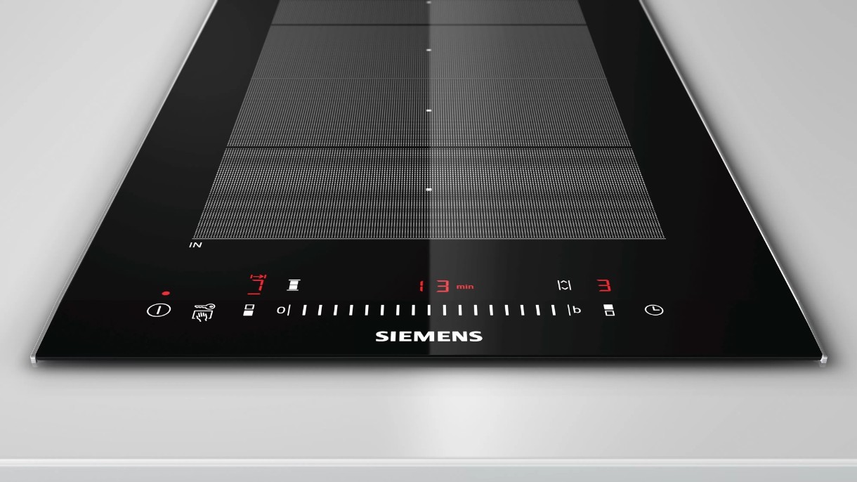 Индукционная варочная панель Siemens для быстрого и тщательного приготовления с небольшими затратами электроэнергии и легкостью очистки прибора.