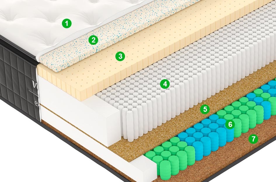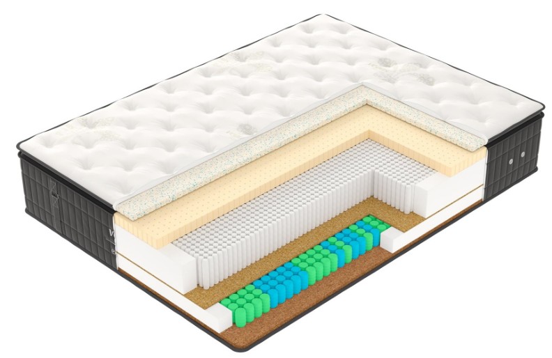 Кокосовая койра:Натуральный материал, состоящий из спрессованных волокон кокосового ореха, полностью пропитанных латексом. Слои из прочной и долговечной кокосовой койры используются для придания матрасу дополнительной жесткости.