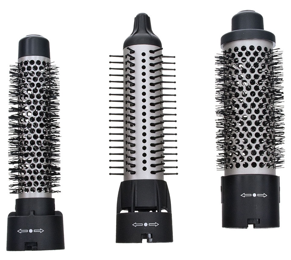 Круглую насадку Ø 25 мм применяют для оформления мелких завитков. Насадка Ø 30 мм с выдвижной пластиковой щетиной формирует средние волны. Насадка Ø 38 мм — разработана для крупных локонов и объема.