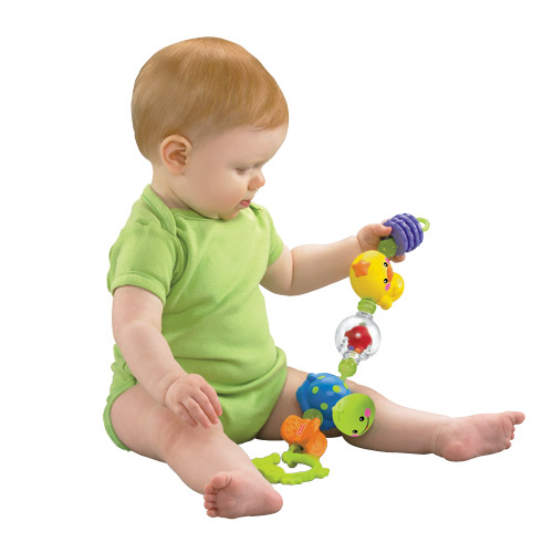 Вращающиеся и гремящие бусины и игрушки-погремушки — а также славная черепашка, блестящее зеркальце и веселый утенок, которые развеселят малыша. Игрушка легко крепится к коляске или игровому коврику для игр в пути и в любом месте!