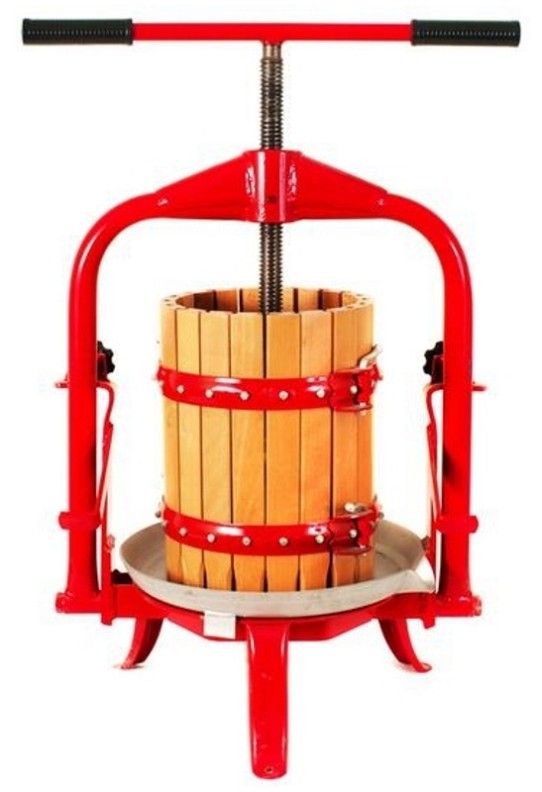 Ножки пресса с отверстиями для крепления пресса стационарно, к удобной для Вас поверхности. Модель может использоваться как в быту, так и в коммерции. Для изготовления корзины (той части пресса, которая соприкасаеться с сырьем) использовался экологически чистый материал — древесина бука. Станина изготовлена из стали и покрашена в яркий красный цвет. Ручной привод выполнен в виде двойной ручки с резиновыми насадками.