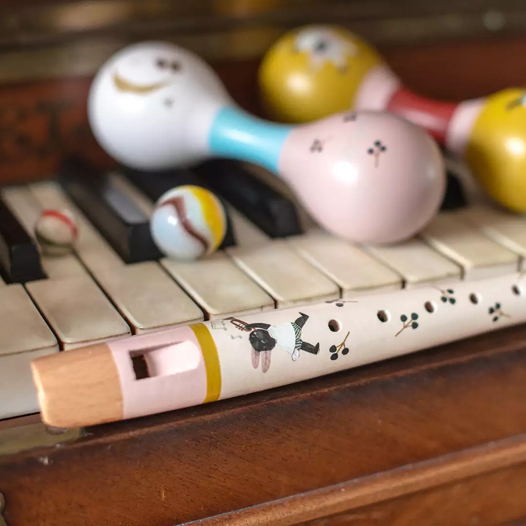 Деревянная флейта с 6 отверстиями, украшенная поэтическими иллюстрациями из коллекции Après la pluie. Она поможет детям развить ритм и музыкальное пробуждение и подходит для маленьких ручек от 3 лет.