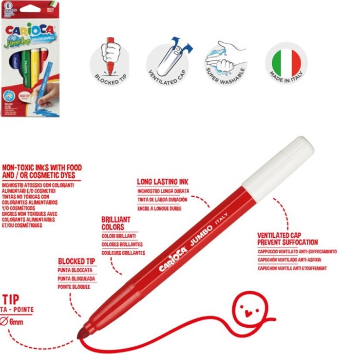 Дополнительные спецификации18 цветных карандашей, 6 макси-маркеров Jumbo, 24 маркера Joy с тонким наконечником, 24 восковых мелка, 12 акварелей