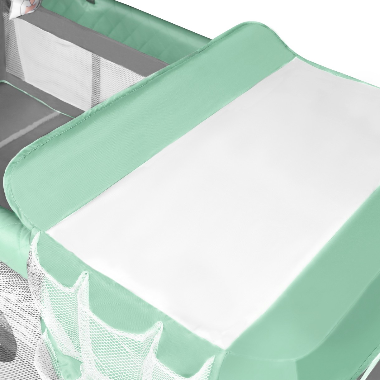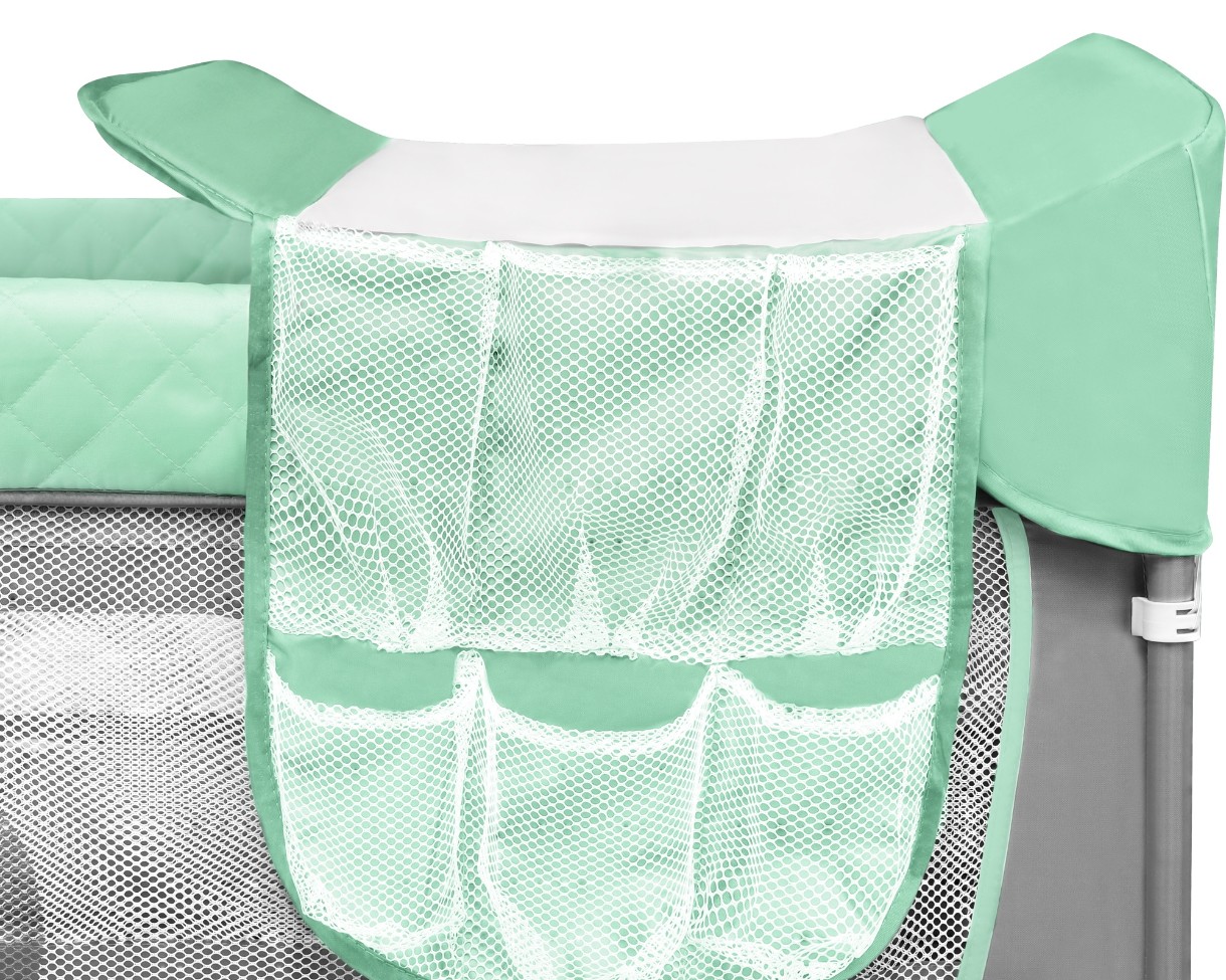 Поднятые края пеленального столика обеспечивают безопасность вашего ребенка, а мягкая подстилка невероятно комфортна. Пеленальный столик изготовлен из грязеотталкивающего материала. Функциональные два кармана позволяют хранить необходимые аксессуары по уходу за ребенком или детские игрушки. Боковые стороны манежа из сетки, что обеспечивает циркуляцию воздуха и хороший просмотр за ребенком.
