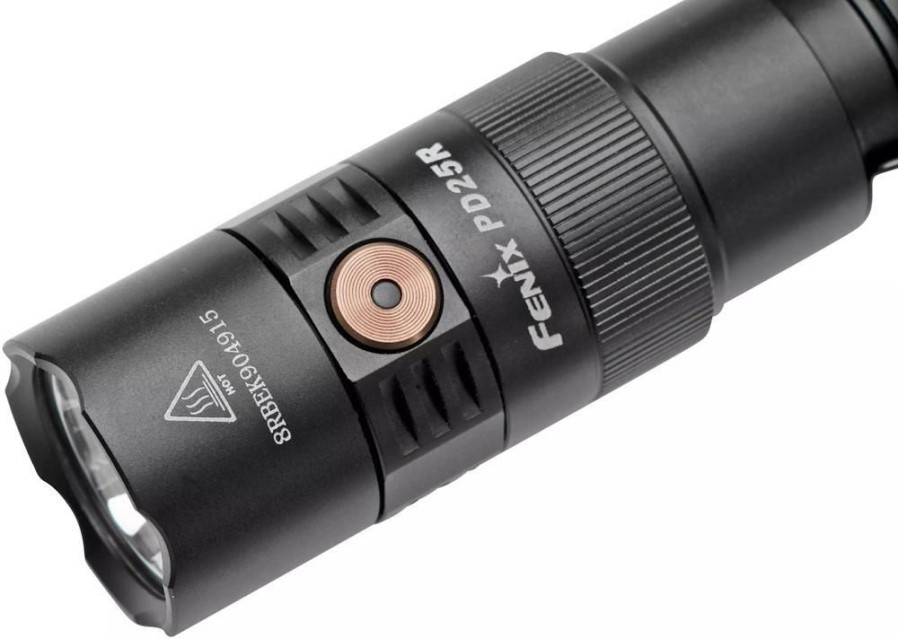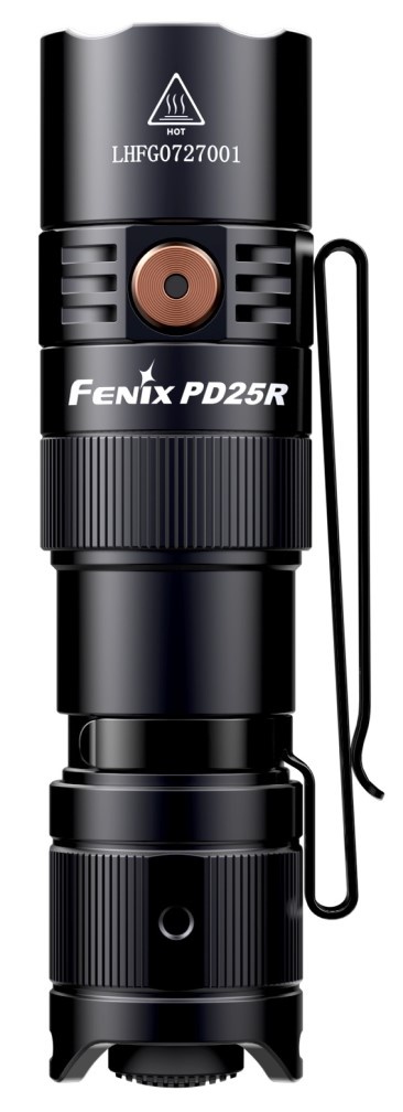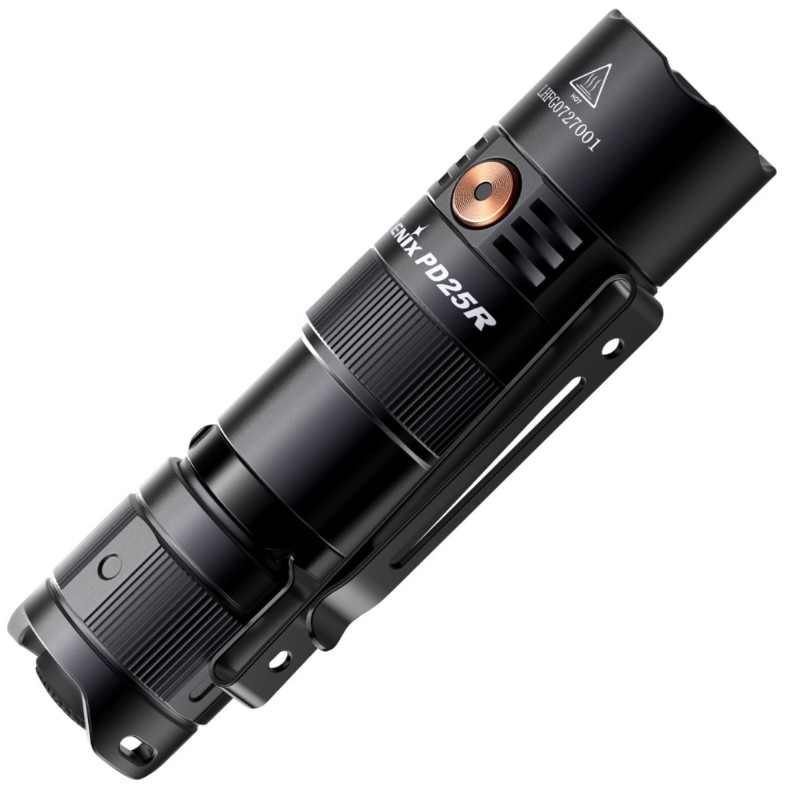 Fenix PD25R простой, но в то же время особенный фонарик с изысканным дизайном, металлической боковой кнопкой со встроенным светодиодным индикатором, пластинами-радиаторами для отвода тепла, отверстиями для ремешка, нескользящей накаткой на корпусе.