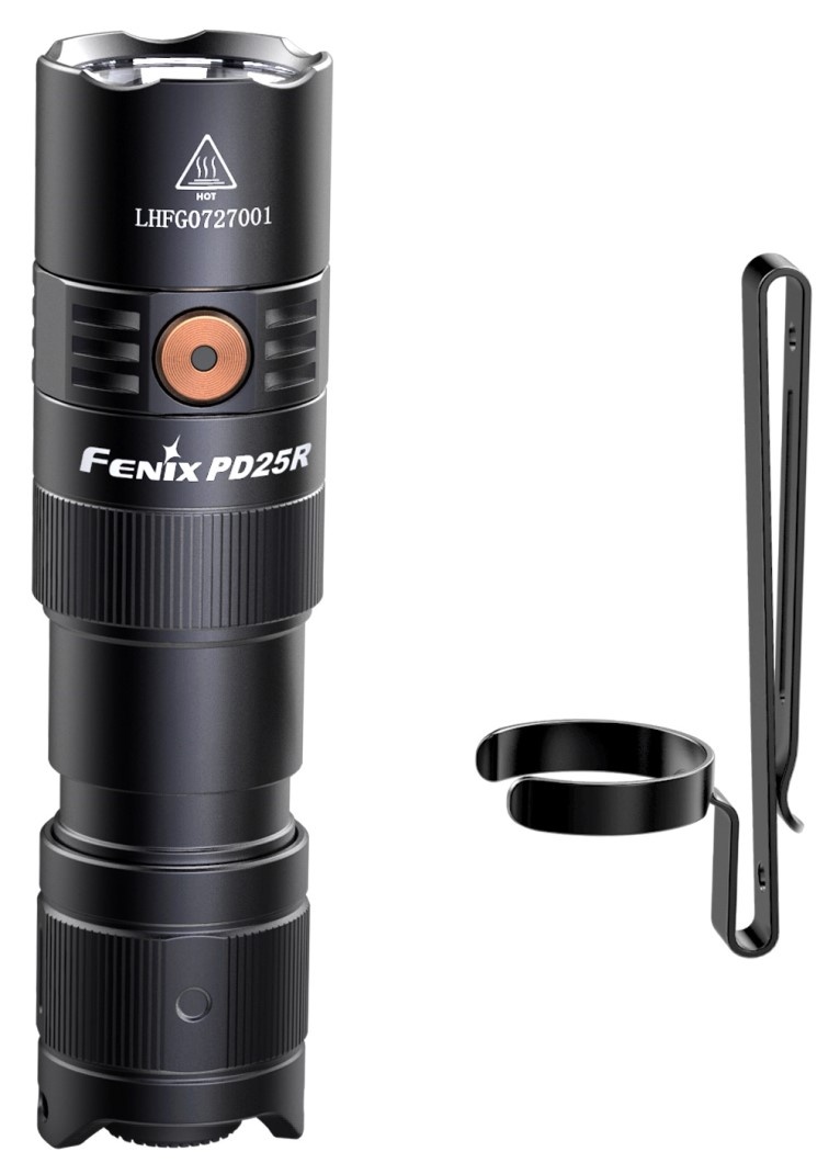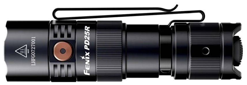 Двухпозиционная клипса освобождает руки, позволяя крепить фонарик к козырьку кепки, карману или на рюкзак. PD25R выполнен в тактическом стиле: у него есть тактическая кнопка в хвосте и металлическая боковая кнопка. Чтобы мгновенно активировать фонарь, достаточно прижать тактическую кнопку, щелчком фиксируется включение фонаря. Боковой кнопкой переключаются режимы яркости и строб сигнал.