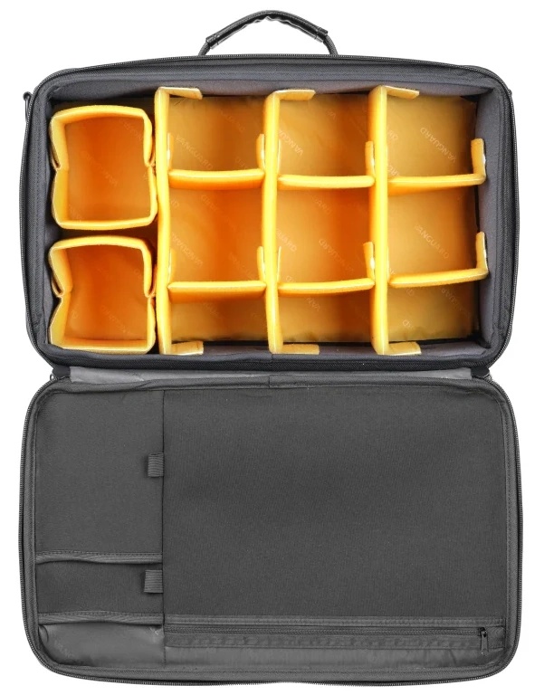 Сумка серии Bag-in-Bag: может использоваться и сама по себе, и в качестве вставки для водонепроницаемых противоударных кейсов Vanguard Supreme, когда вам необходима максимальная защита. Выполнена из прочного рип-стоп полиэстера 1000D с внутренним наполнителем из EVA пены и мягкой вельветовой подкладкой, оснащена металлическим каркасом, благодаря чему она хорошо сохраняет форму, а также защищает технику при случайных ударах и падениях. Внутреннее пространство организуется с помощью 3 длинных и 6 коротких разделителей на липучках + еще 2 разделителя новой формы («стакан»). Крышка закрывается на молнию с защитой от капель воды.