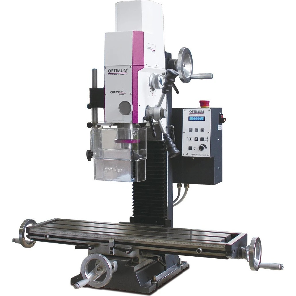 Optimum OPTImill MH 22V — это настольный сверлильно-фрезерный станок профессионального класса с бесступенчатым электронным управлением скоростью вращения шпинделя. Модель отличается компактными габаритами и высокой жесткостью благодаря использованию шпинделя с конусом BT20.
