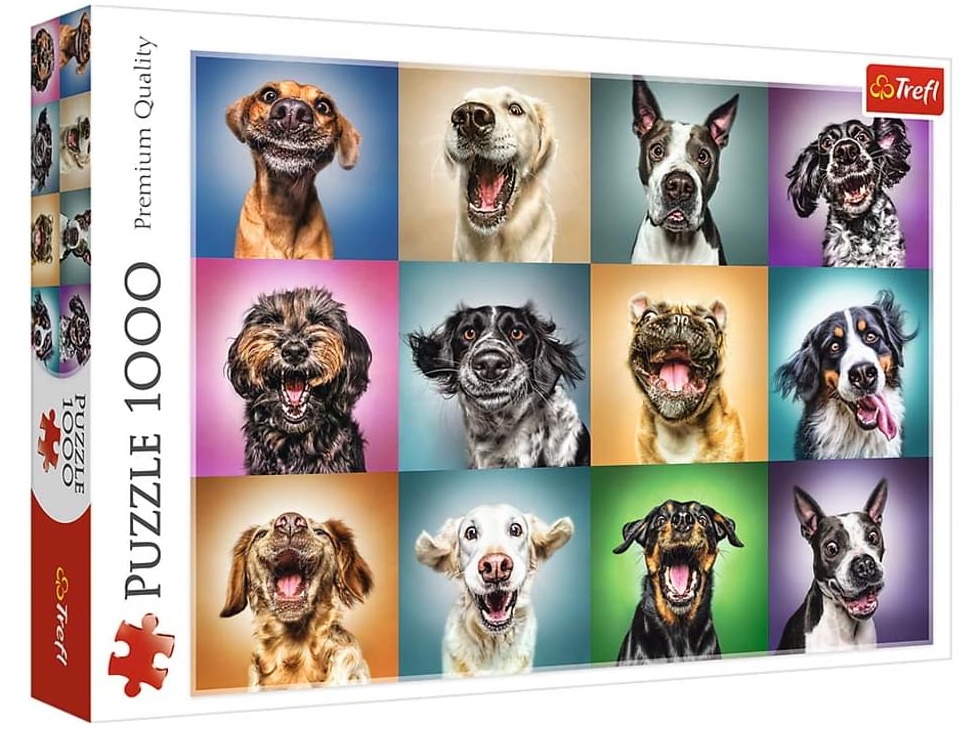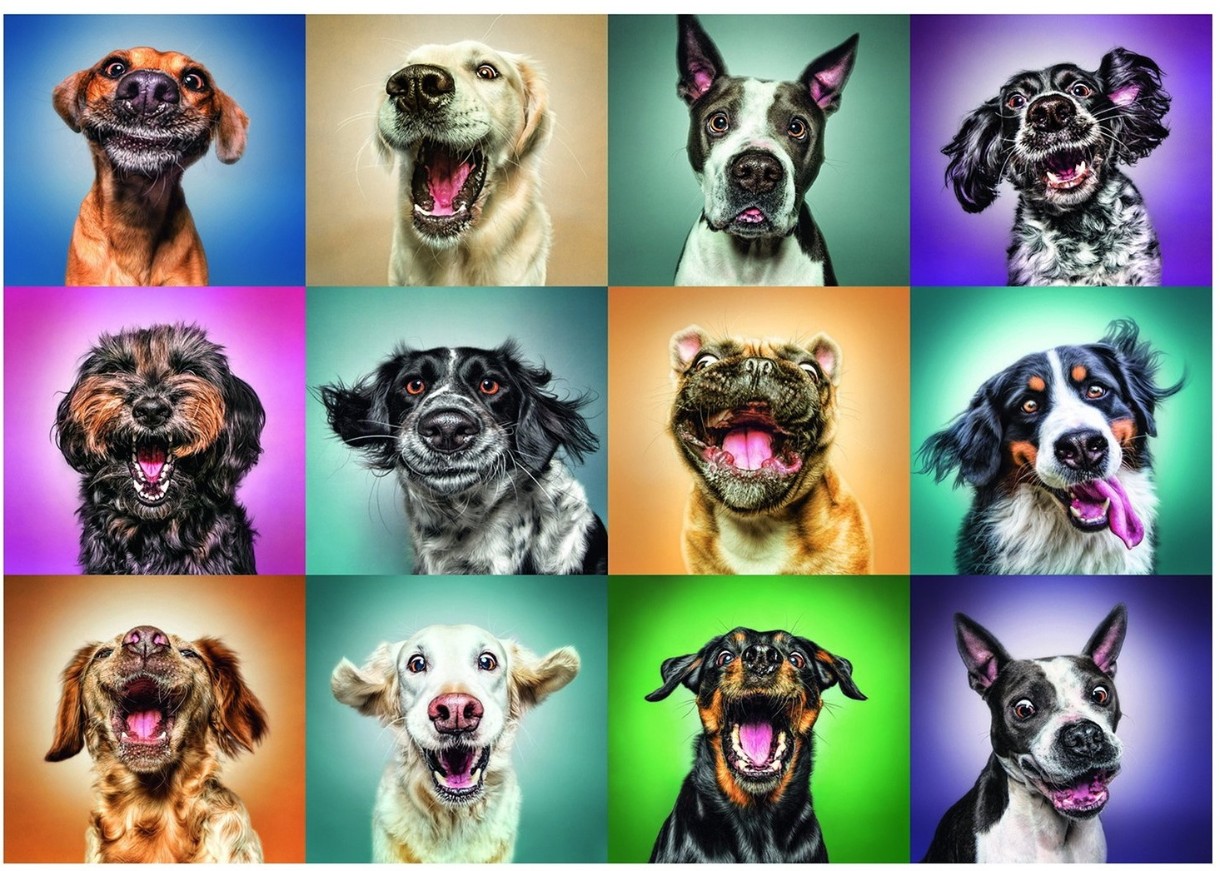 Пазлы на 1000 элементов с фотографиями целого собрания забавных собачьих портретов, изображенных в виде коллажа. В сложенном виде мы получим картинку размером 68х48 см., которая будет прекрасным подарком для поклонников животных и может стать отличным декором для стен Вашего дома. Высокое качество, насыщенность цветов и безопасность при сборке пазлов обеспечивает специальный каландрированный картон, который отражает свет и покрыт экологическими красками.
