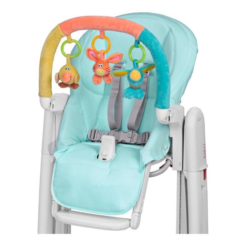 Комплект состоит из тонкой накидки, которая аккуратно надевается поверх основного чехла стульчика, а также пластиковой дуги с подвесными игрушками. Игрушки привлекают внимание малыша, способствуют развитию моторики и делают времяпрепровождение более интересным и увлекательным.