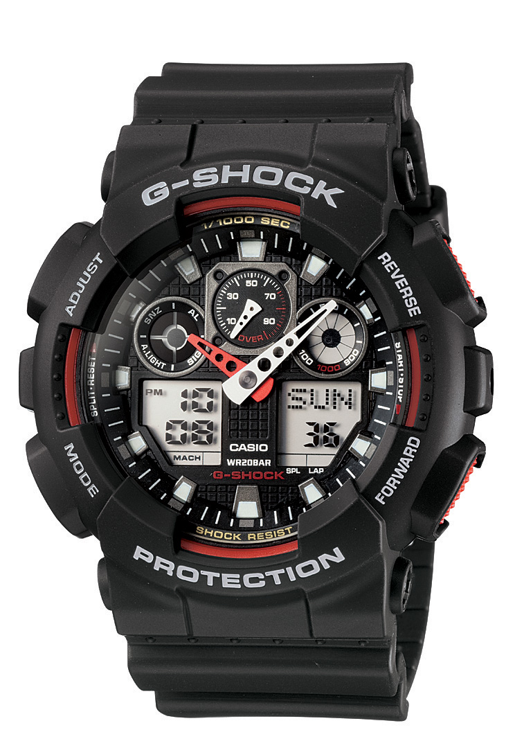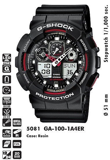 Грозные аналоговые и цифровые часы с громадным корпусом. Придерживаясь чётких линий модельного ряда G-Shock, GA-100 оборудована «Тремя глазами» и непревзойдёнными водо и ударо устойчивыми характеристиками, которые так свойственны всем G-Shock. Модель GA-100 также можно отнести к уникальной концепции, которая создает своим внешним видом чёткий
