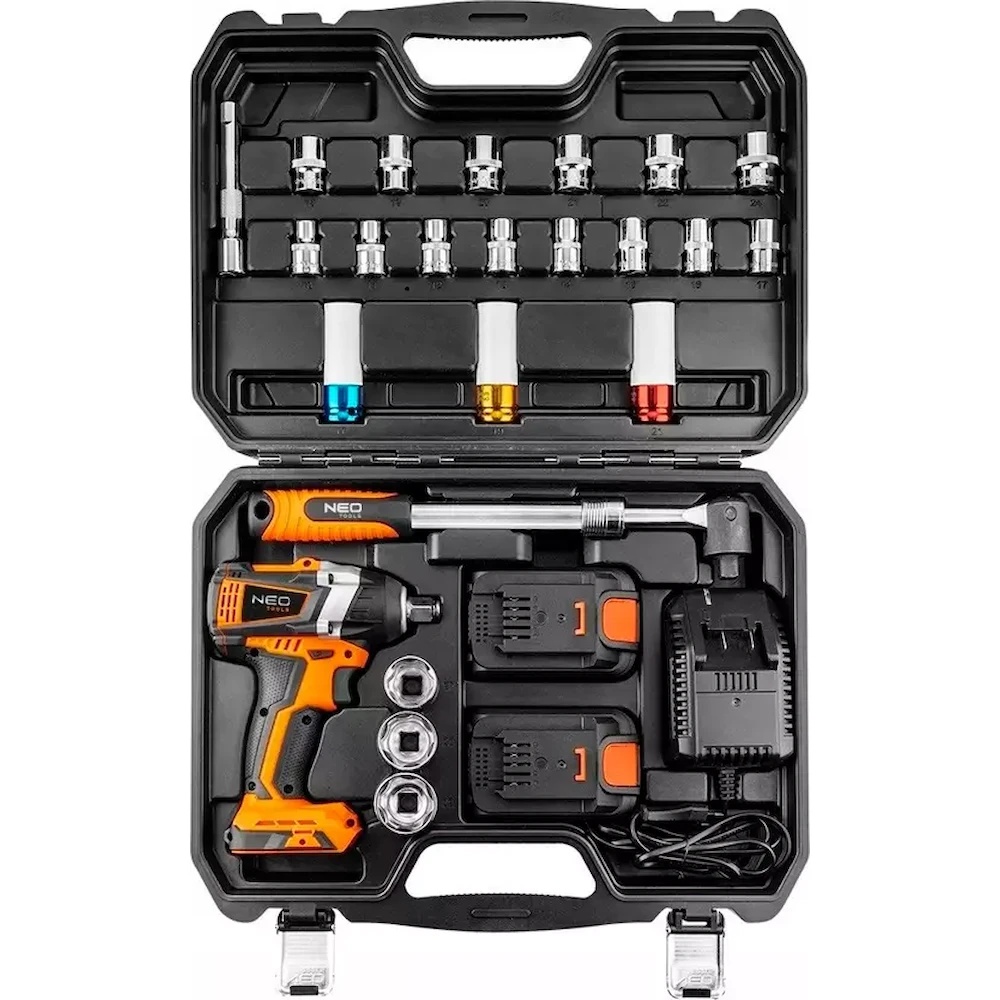Набор инструментов NEO , предназначенный для работ, связанных с заменой колес, ремонтом подвески, тормозов и т. д. В прочном, удобном чемодане вы найдете отличный набор, состоящий из: - NEO Energy+ 18В, бесщеточный ударный гайковерт 1/2" - 2 2Ач 18В Energy + аккумуляторы и быстрозарядное устройство - 3 ударные головки Cr-Mo NEO размером 17 мм, 19 мм и 21 мм, предназначенные для откручивания и затяжки болтов крепления колес автомобилей, в том числе алюминиевых дисков. - телескопическая ручка NEO с шарниром 1/2" - регулировка длины от 330 мм до 480 мм - удлинители NEO 125 мм, 1/2" - набор головок Cr-V, NEO, SUPERLOCK - размерами от 10 мм до 32 мм.