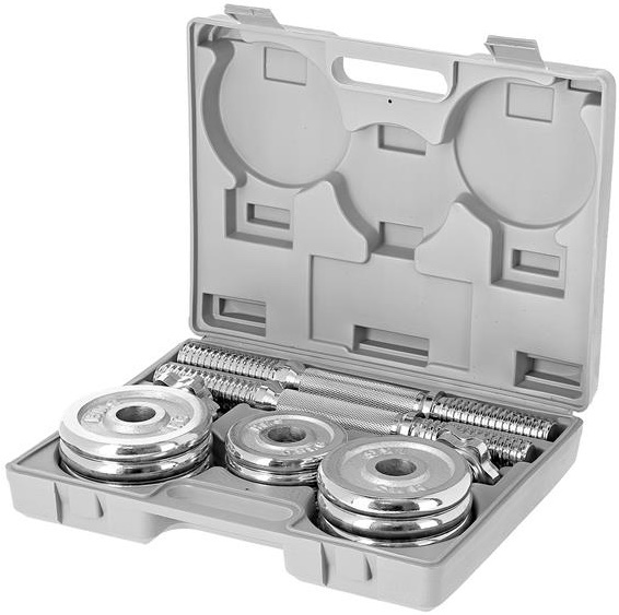 STC15 HMS-гантели в чемодане весом 15 кг — это классический домашний тренажерный зал. Продукт характеризуется высокой мобильностью, его также легко хранить. Набор выполнен из материалов самого высокого качества. Есть профессиональные хромированные и дополнительно усиленные грифоны с крепкими винтовыми зажимами. Они имеют резьбовые концы, так что осаждение нагрузки является простым и быстрым (блокируется их быстрое движение с помощью стопорной гайки). Зажимы равномерно нажимают пластины и не царапаются. Захватывающая часть имеет рифленую ручку, которая обеспечивает надежное сцепление с ручкой. Набор упакован в практичный чемодан для легкой транспортировки.