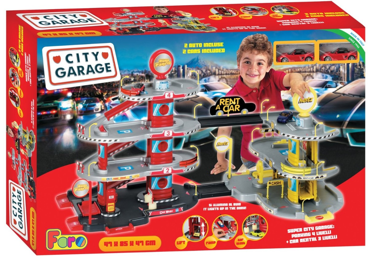 ''City Garage'' представляет собой две парковки 4-х уровневую и 3-х уровневую, соединенные между собой дорогой. С помощью лифтов машины попадают на верхние этажи парковок, а спускаются по серпантинному пандусу. Подъем лифтов осуществляется вращением рекламного щита, находящегося на верхних этажах парковки. На первом этаже находятся бензозаправка, мойка машин с крутящимися валиками, подъемник для ремонта машин, а также диспетчерская. В темноте парковка освещается. В комплекте с парковкой идут 4 металлических машинки размером 8 х 2 см. Дополнительно к набору прилагаются наклейки и инструкция по сборке.