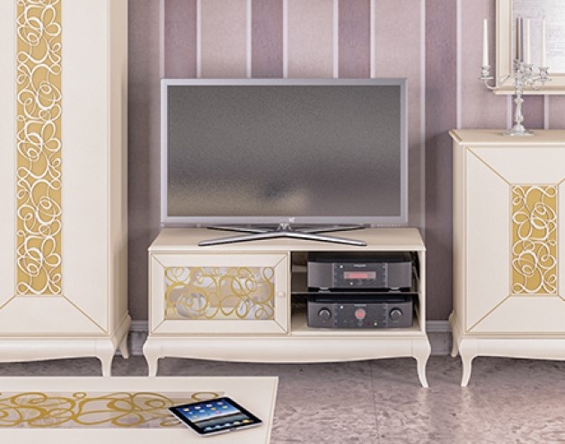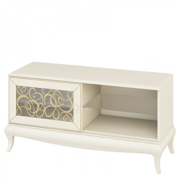 Тумба РТВ Гармония идеально впишется в дизайн фактически любой гостиной благодаря светлым оттенкам, которые, к тому же, подчеркивают ее привлекательность. Кремовый цвет с патиной под золото добавляют дополнительную роскошь.
