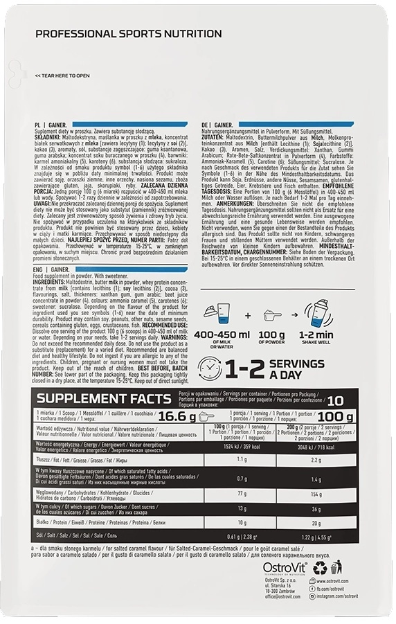 OstroVit Gainer — это серия углеводных и белковых добавок, предназначенная, в частности, для всех физически активных людей. Продукт имеет высокое содержание углеводов (77%), которые являются основным источником энергии в нашем рационе.