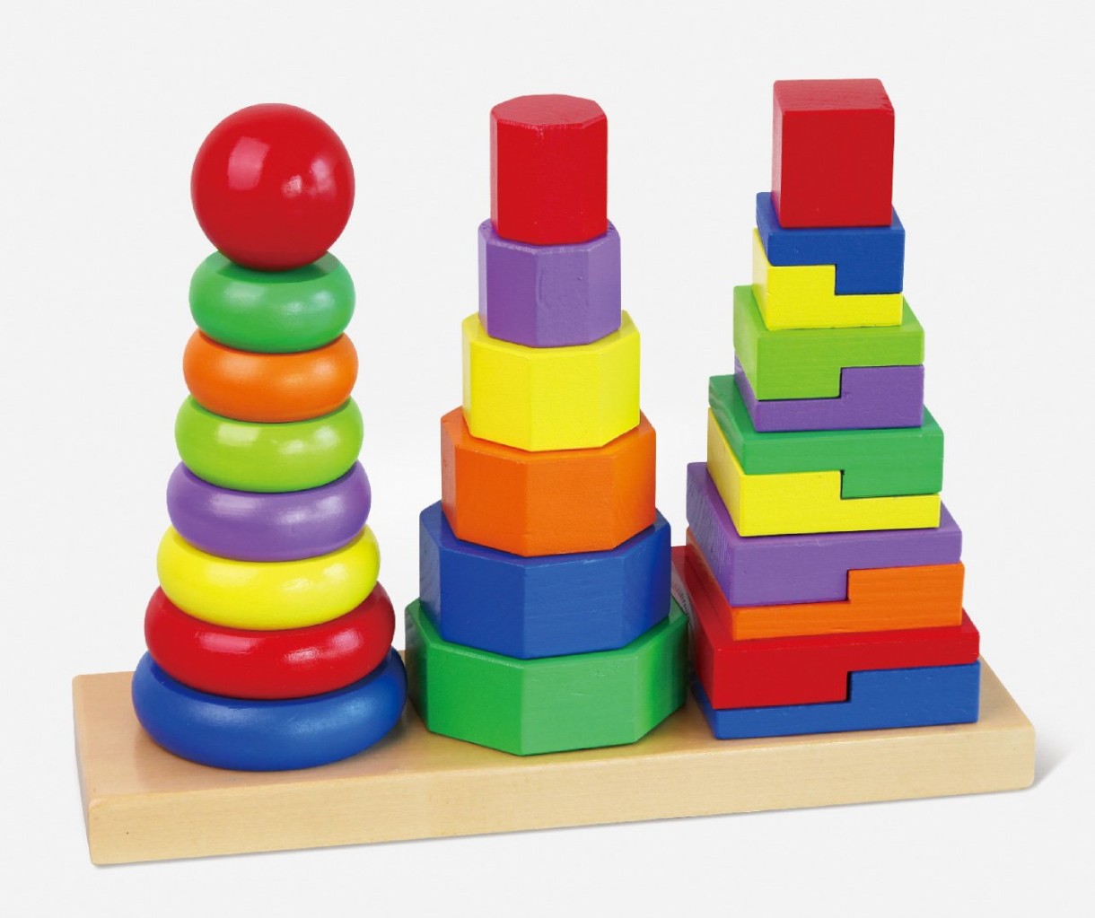 Это необычная Пирамидка. На деревянной подставке располагаются сразу 3 разных по форме пирамидки – пирамидка «квадрат», пирамидка «восьмиугольник» и пирамидка «круг». С помощью этих необычных пирамидок малыш научится определять форму и цвет, сравнивать предметы по величине и раскладывать их в определенном порядке.