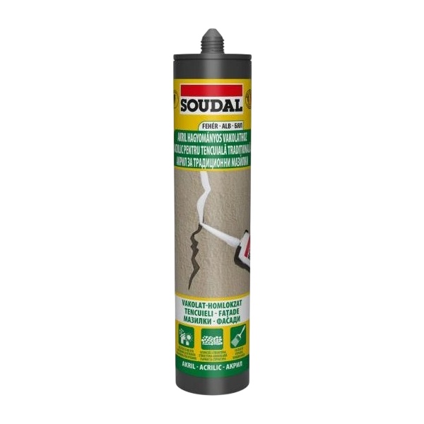 Герметик акриловый для фасадов Soudal - это высококачественная однокомпонентная пластоэластичная герметизирующая паста с зернистой структурой на основе акриловой дисперсии. Его структура схожа с фактурой наружной штукатурки.