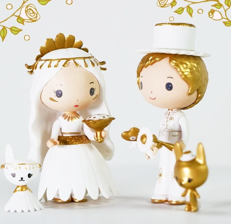 А вот и невеста....... Давайте поприветствуем счастливых молодоженов Маргариту и Леопольда в сопровождении их неразлучных спутников Марго и Лео. Маргарита и Леопольд образуют красивый дуэт бело-золотистых фигурок, принадлежащий поэтической вселенной Tinyly.